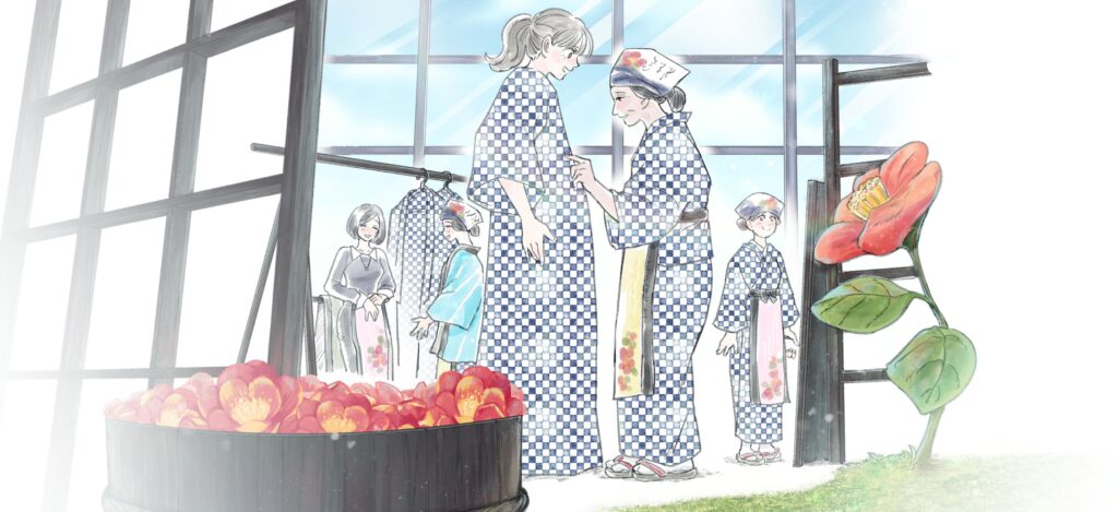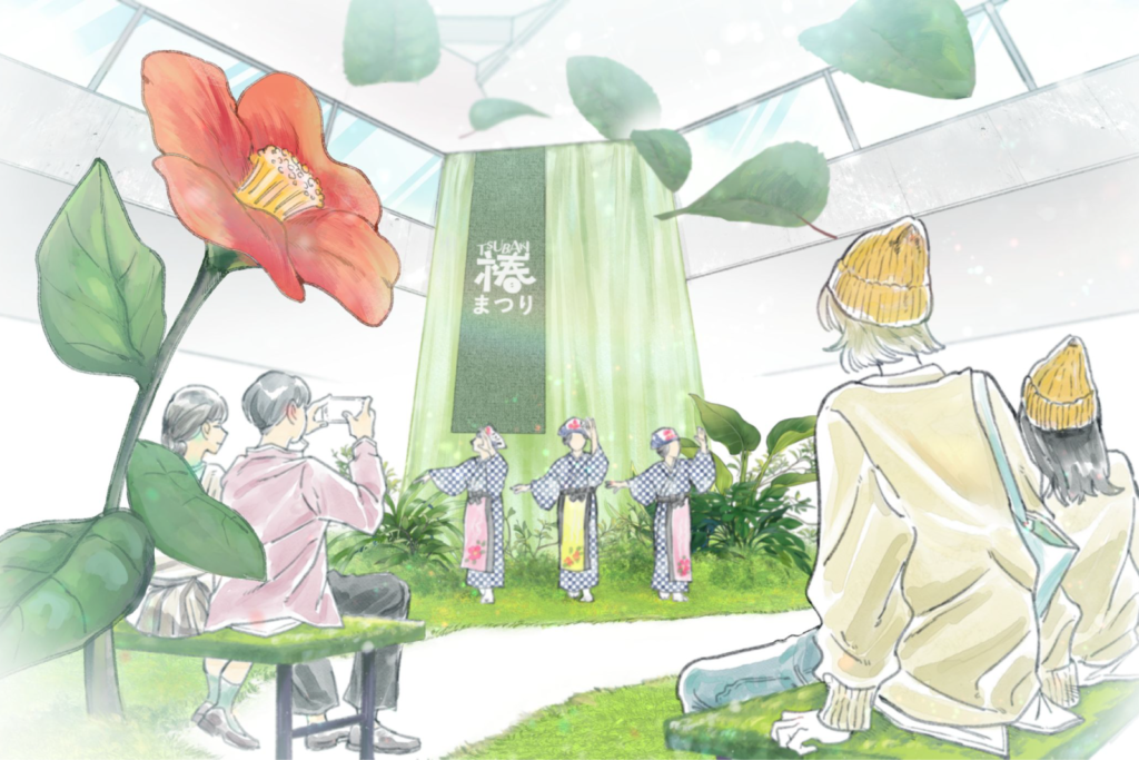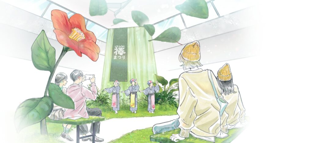 今回のサブテーマは、「春のおとずれ、おどる島」。椿の花が咲きほころぶ瞬間の高揚感と、島じゅうに広がるお祭りのような空気——その“春の立ち上がり”を、会場全体で表現していきます。イラストの中にも、椿がふわりと舞うような軽やかさや、人の気配が生むあたたかなリズムが描かれていて、今年の椿まつりが目指すムードを先取りできるはずです。