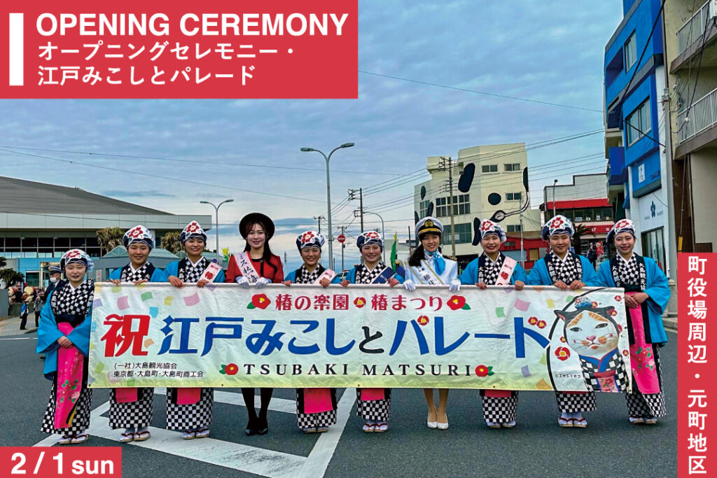 椿まつりの幕開けを祝うオープニングセレモニー。鏡開きや友好市町村との交歓会に続き、勇ましい江戸みこしと党内各団体による華やかなパレードが、大島のまちなかをにぎやかに練り歩きます。