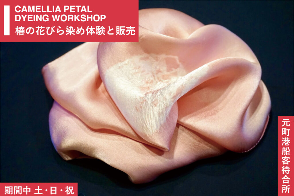 椿まつり期間中の土・日・祝日、元町港船客待合所内で「椿の花びら染め体験」を開催。椿の花びらの染め液を使って、ハンカチやスカーフをやさしい色合いに染め上げる体験が楽しめます。